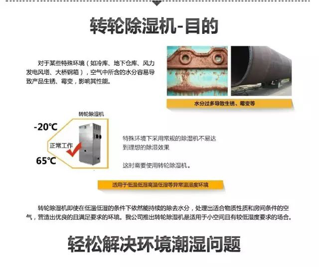 轉(zhuǎn)輪式除濕機除濕量大,除濕效果好,適用面積廣,設(shè)有全自動除濕裝置,現(xiàn)已被廣泛應(yīng)用于國防軍工、航空航天、食品電子、醫(yī)藥化工、機械制造、紡織化纖、紙品印刷、焊接噴涂、木材制品、港口、造船、人防工程等眾多領(lǐng)域。